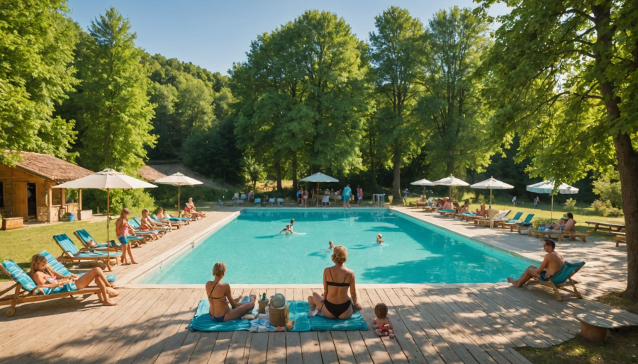 - Équipements aquatiques complets : privilégiez les camping avec piscine couverte Dordogne offrant bassins chauffés (25-28°C), pataugeoires sécurisées et toboggans pour enfants